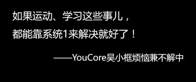 為什么有些人即便在父母的嚴(yán)厲鞭策下考到了牛逼的大學(xué),但在沒有父母鞭策的環(huán)境下就一蹶不振,肆意妄為了呢,原因很大可能就是因為原始的驅(qū)動力并非來自自己。這與之前YouCore文章講過的制定目標(biāo)的原理是一樣的(YouCore公眾號回復(fù)1005獲?。?/span>,假大空的標(biāo)語是沒辦法促進(jìn)我們的系統(tǒng)1快速思考做出決策的。